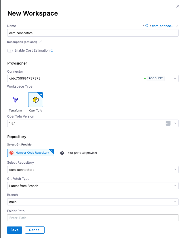 • Choose Harness Code Repository and select the repository we created in the first step. Select main as the branch and the folder path should be blank as we created the main.tf in the root directory.