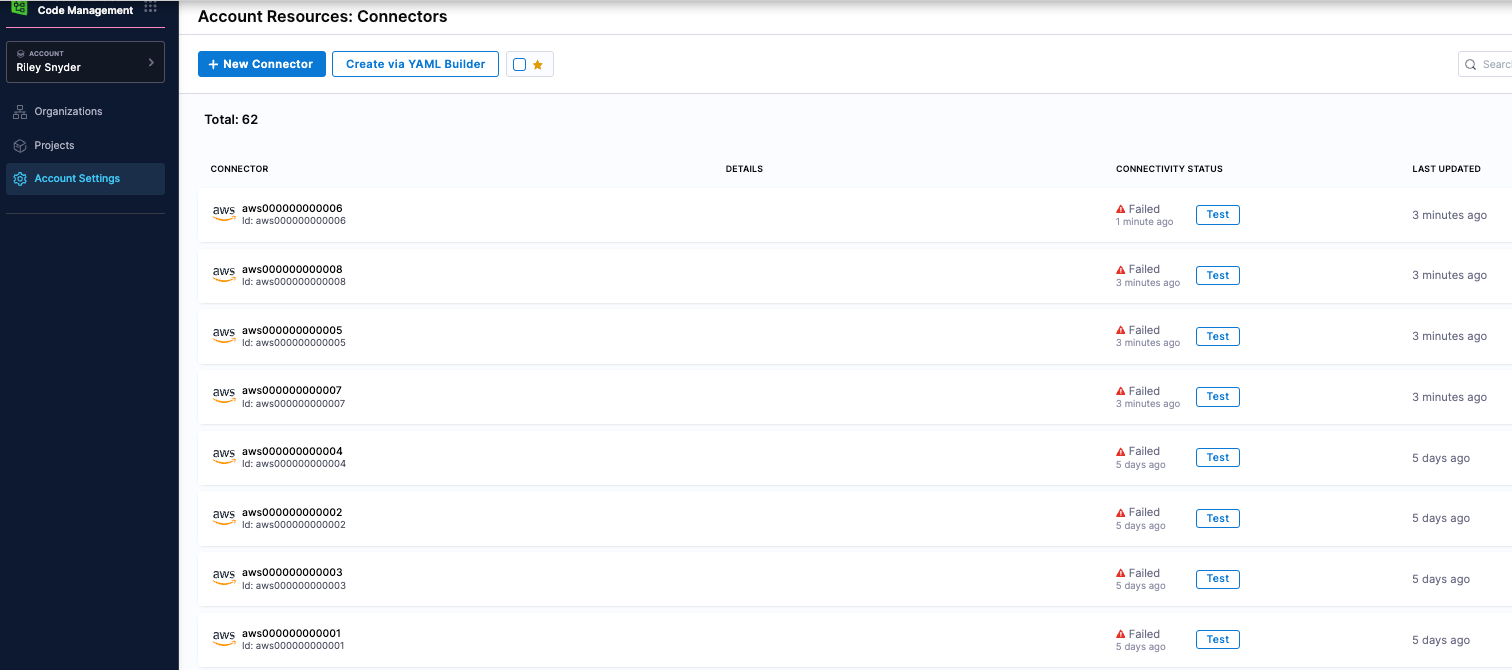 1. After the pipeline is complete, navigate to connectors in account setting and verify the connectors created. In the screenshot below, the status is failed only because the IAM role I'm expecting isn't in the accounts yet.