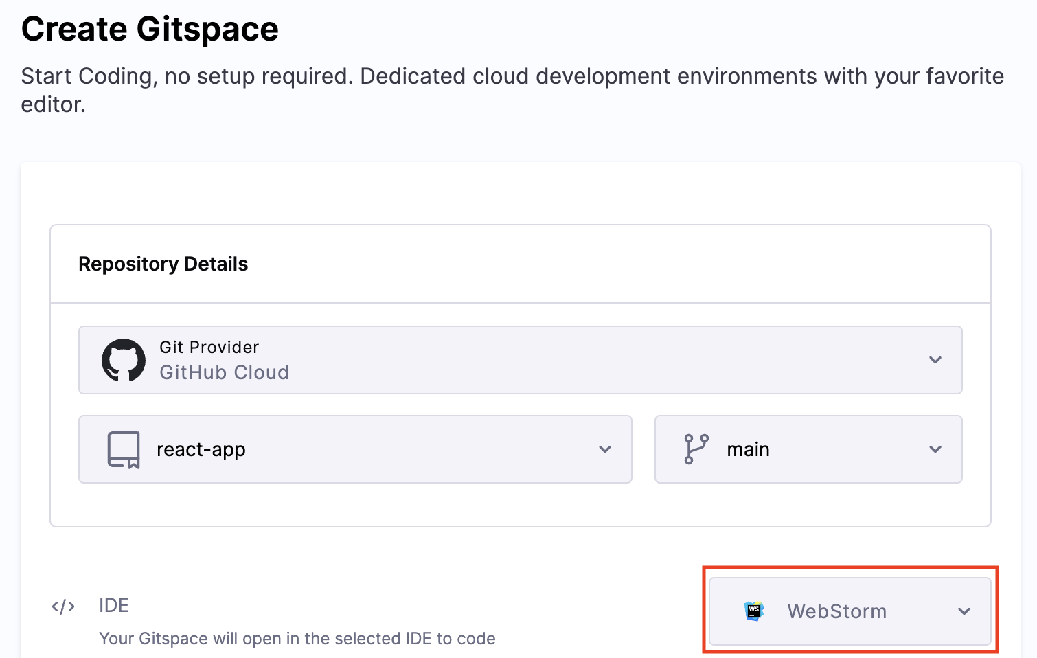 2. Select "WebStorm" as the IDE during Gitspace creation.