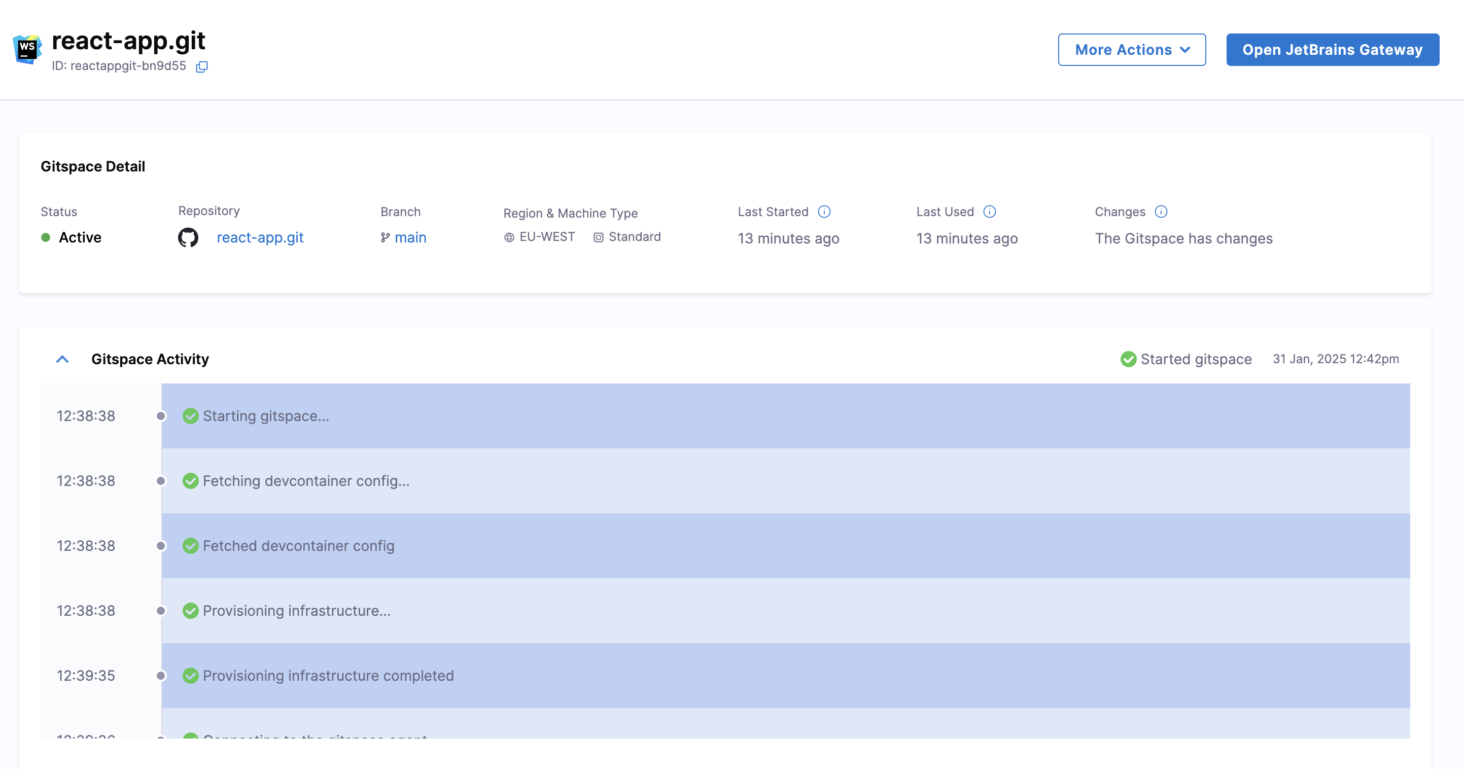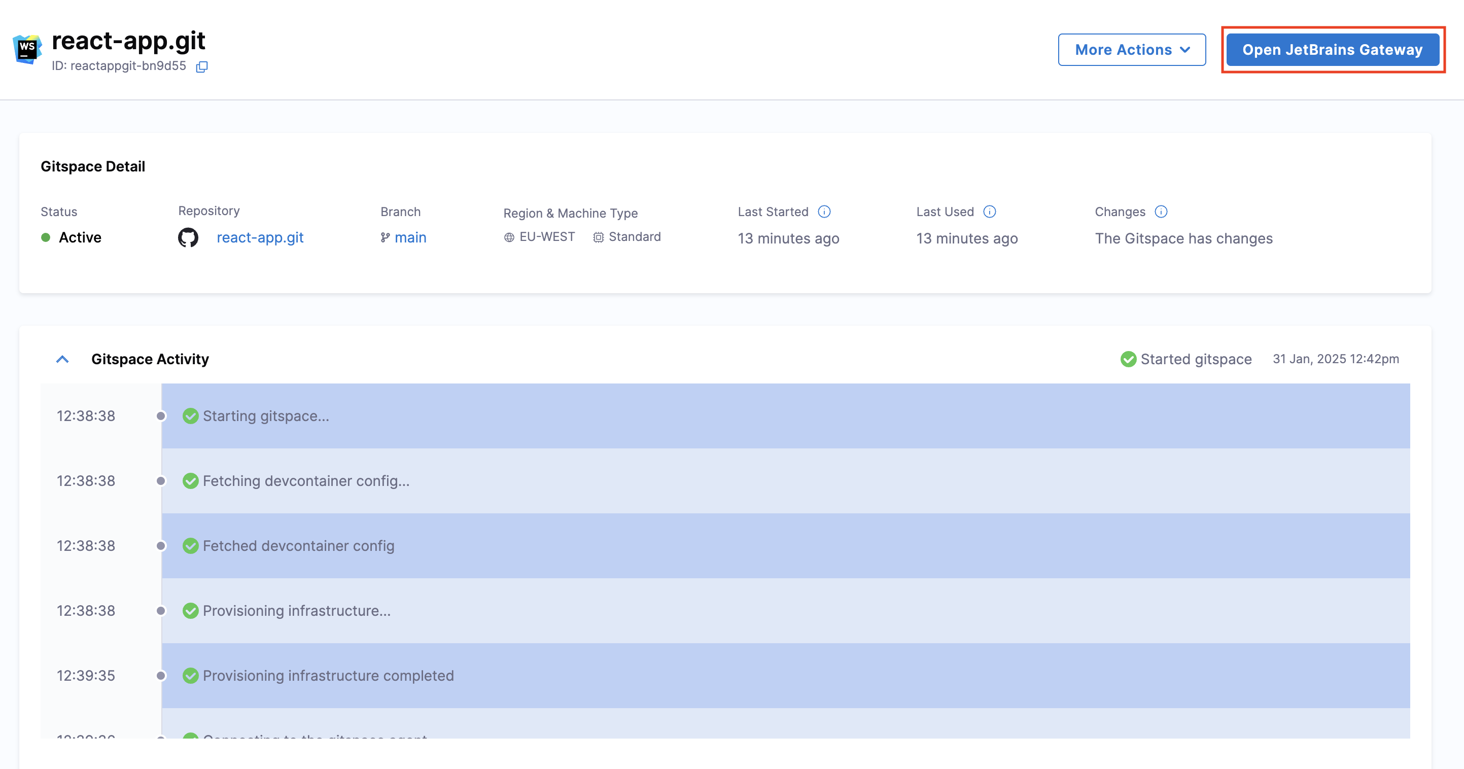 1. Once the Gitspace is created and running, click on the "Open JetBrains Gateway" button.
