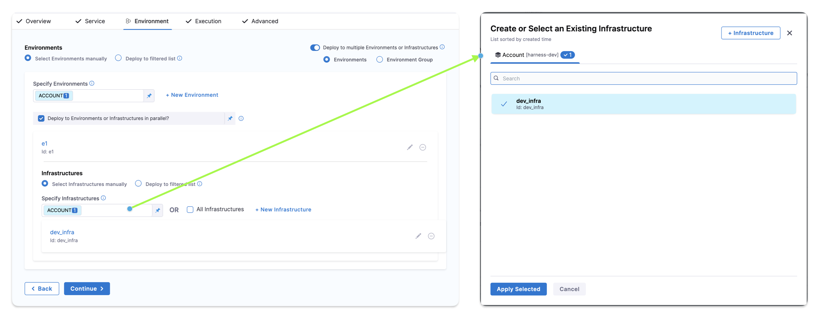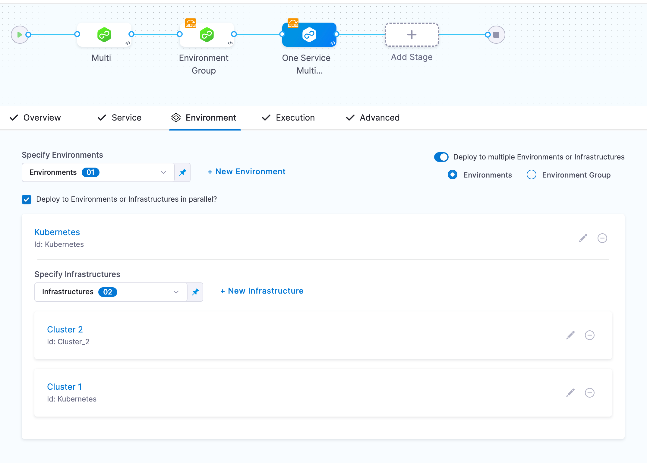 In Environments, enable Deploy to multiple Environments or Infrastructures. You can select one or more environments, and then one or more infrastructures in each environment.