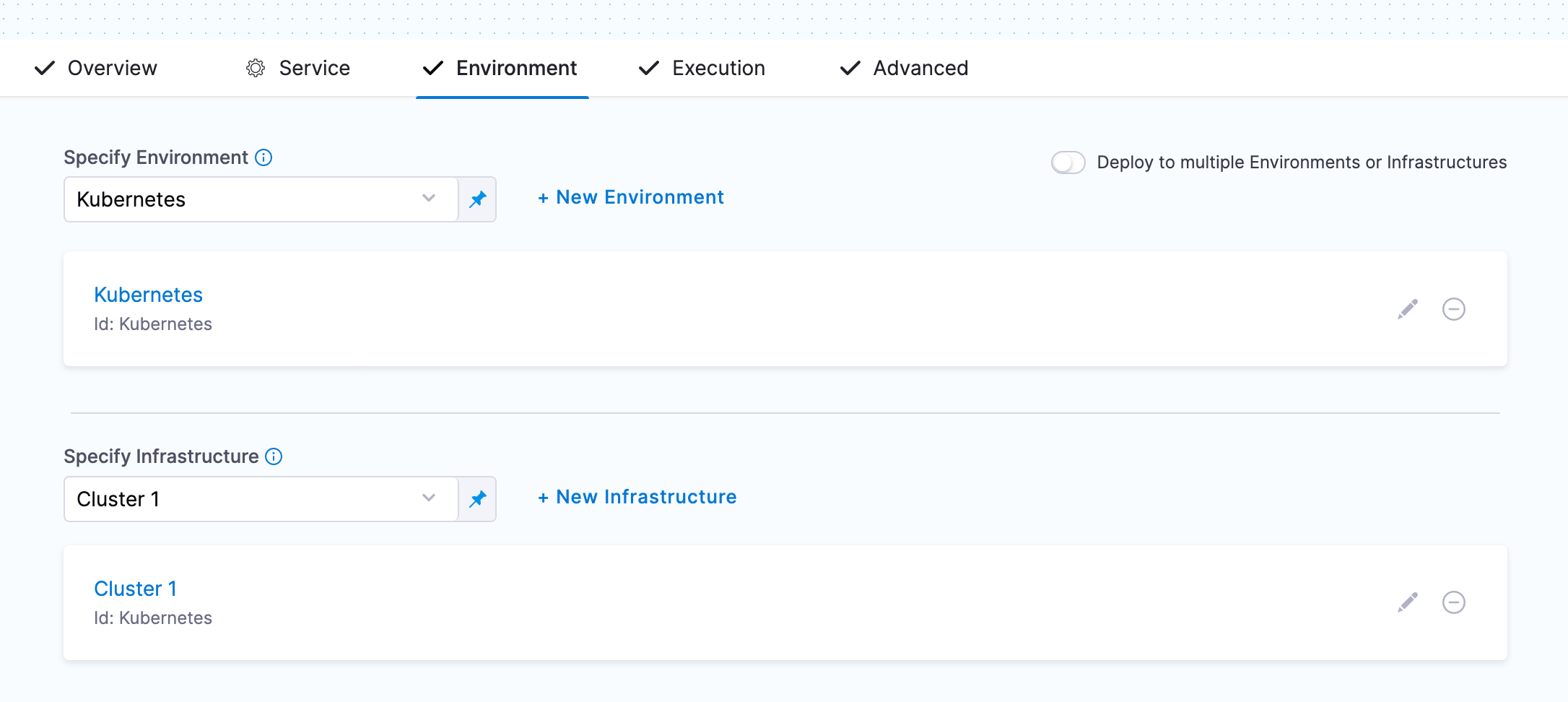 - In Environment, select a single environment and infrastructure. You don't need to enable Deploy to multiple Environments or Infrastructures.