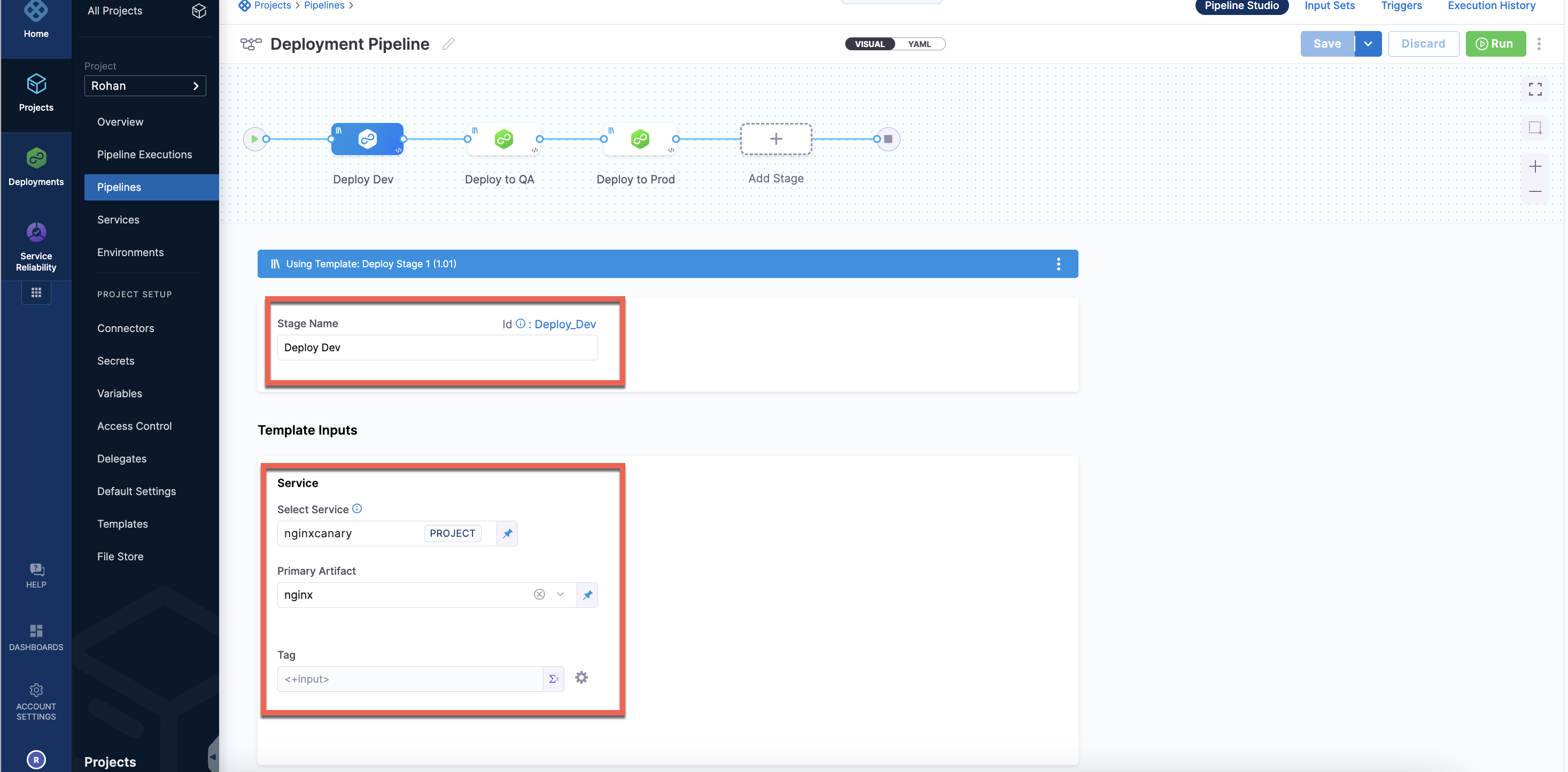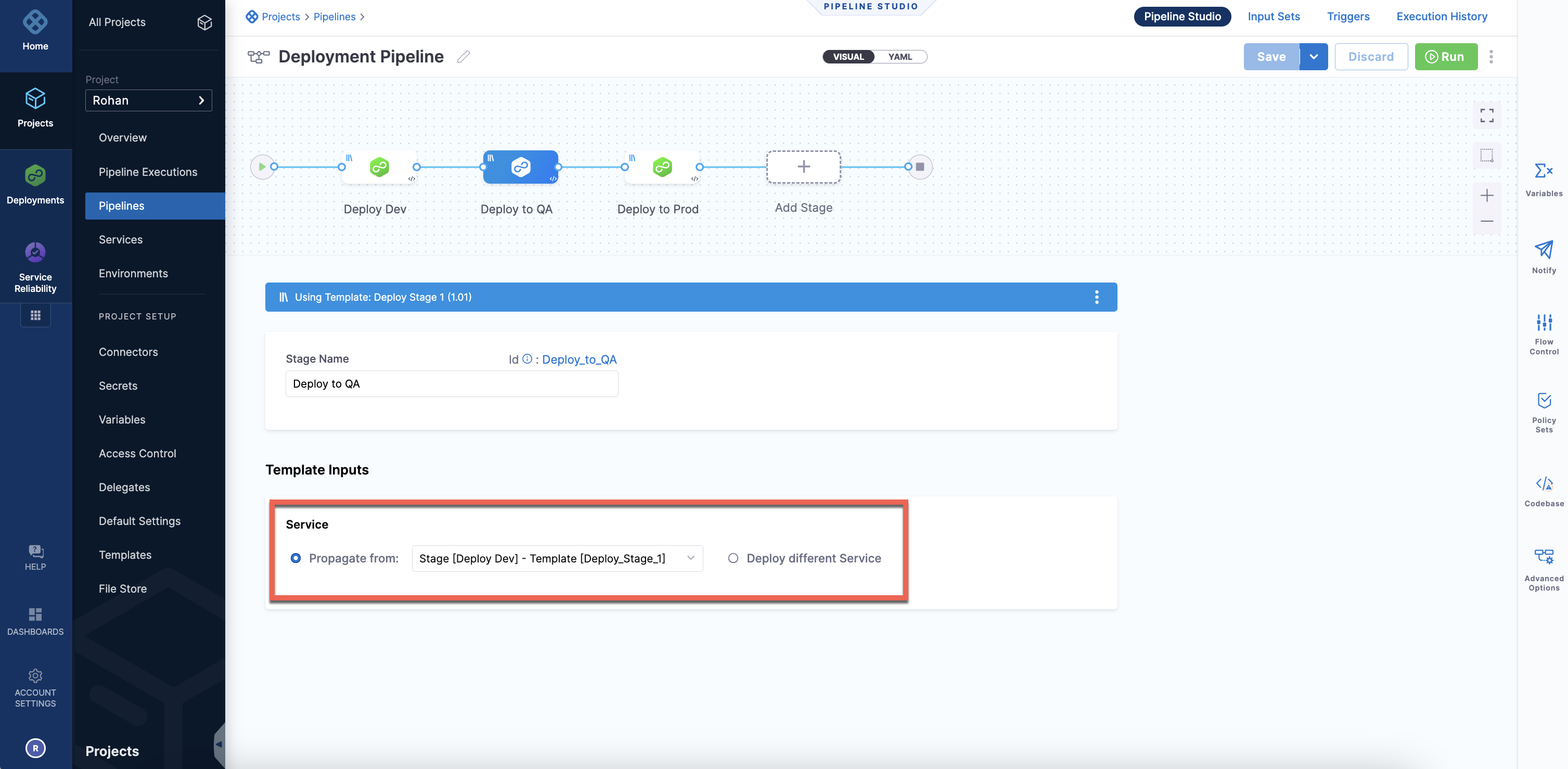 When defining a pipeline, you can pass the service, its variables, artifact, and manifest inputs through multiple stages. You can propagate a service from a previous templated or non-templated stage. You can also propagate a service from one templated stage to another stage referring to a different template.
