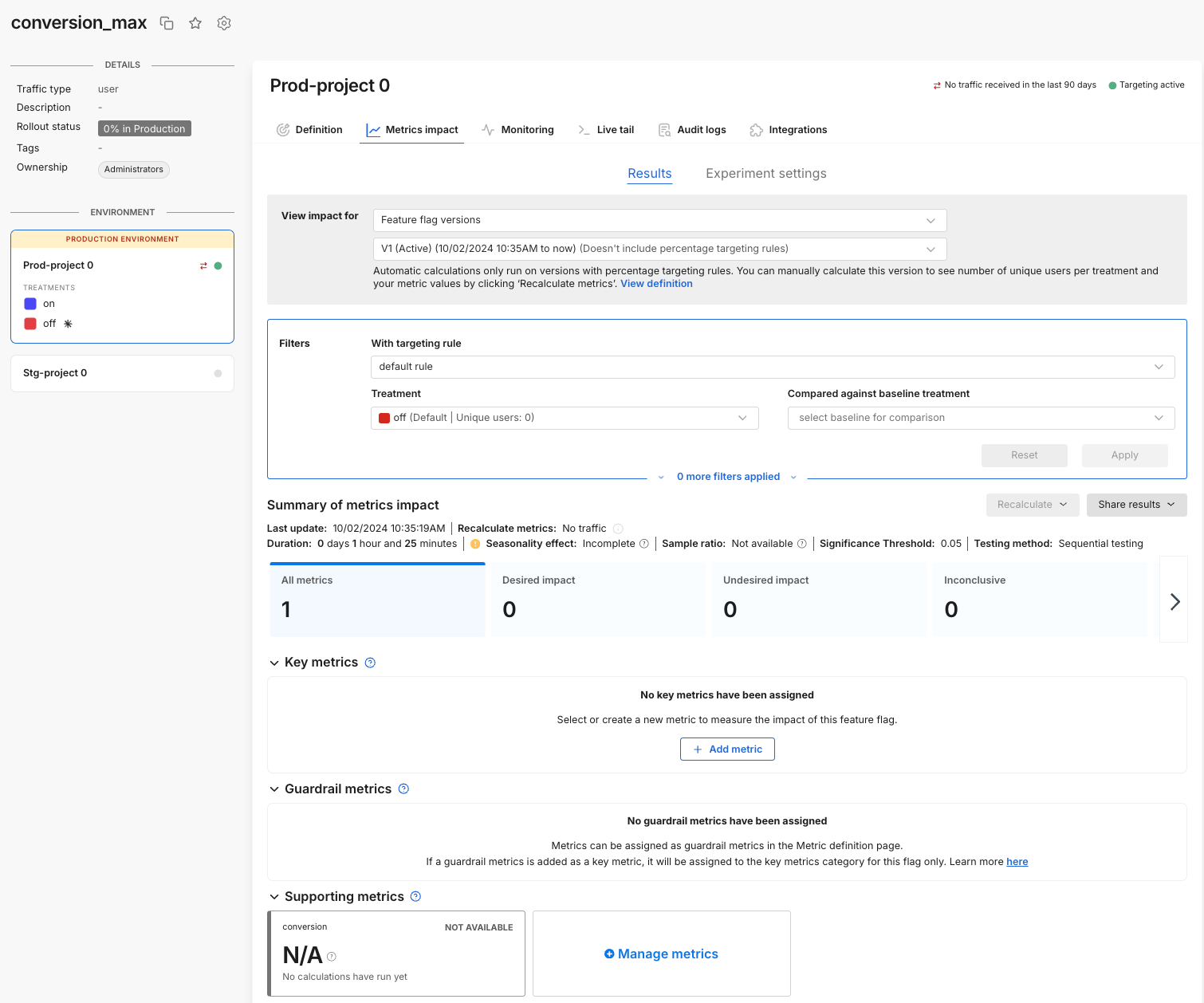 2. From your feature flag, click the Metrics impact tab. The Results page appears.