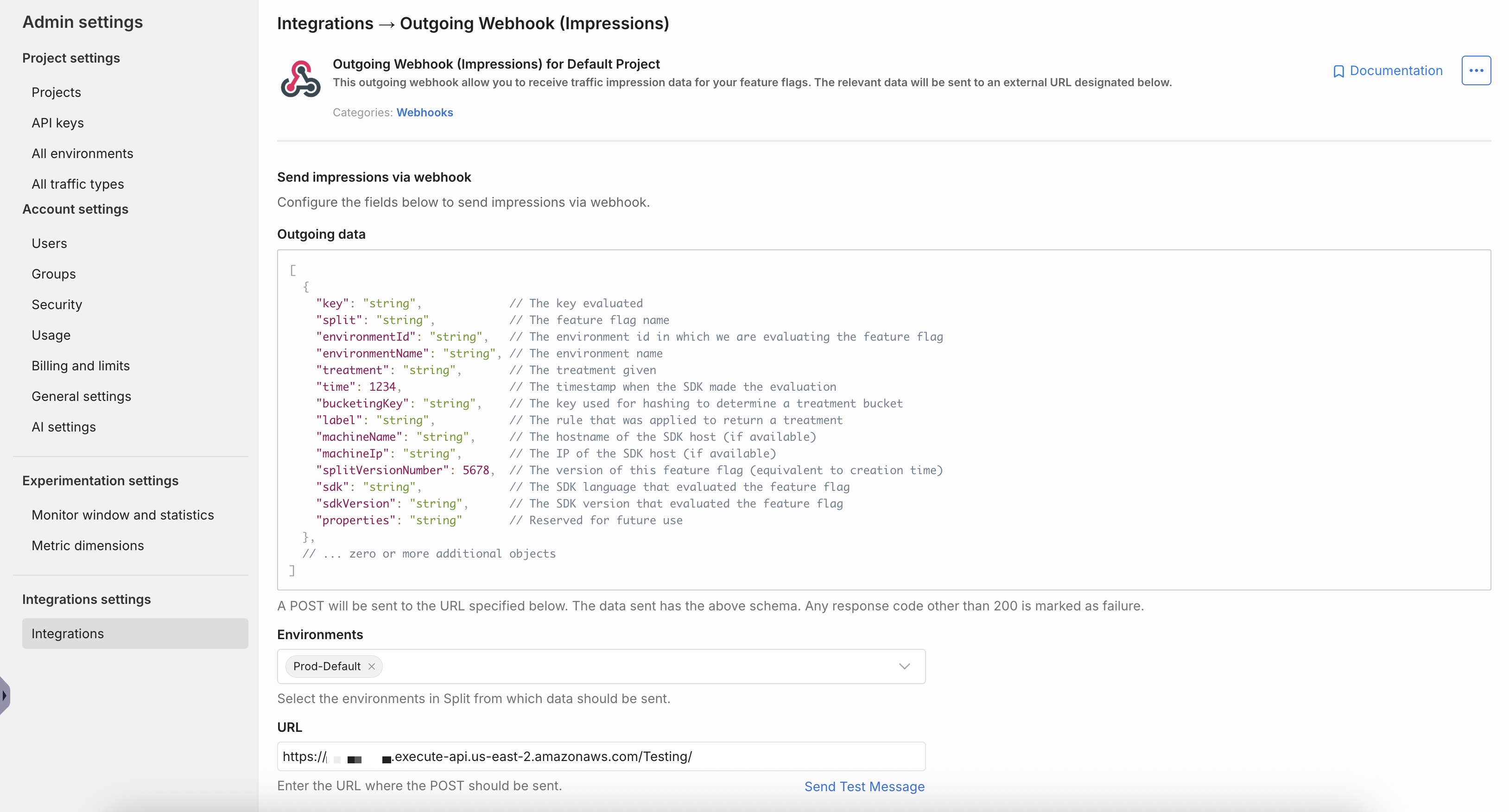 19. Your Webhook service is ready now, login to the Split user interface, go to Admin Settings, click on Integrations, and click the Add button for Outgoing Webhook (Impressions).