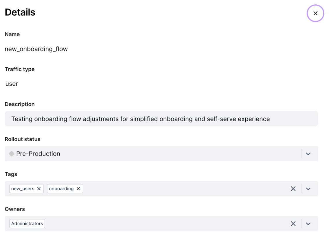 Click the Gear icon next to the feature flag title and select Edit details. The Details view appears.