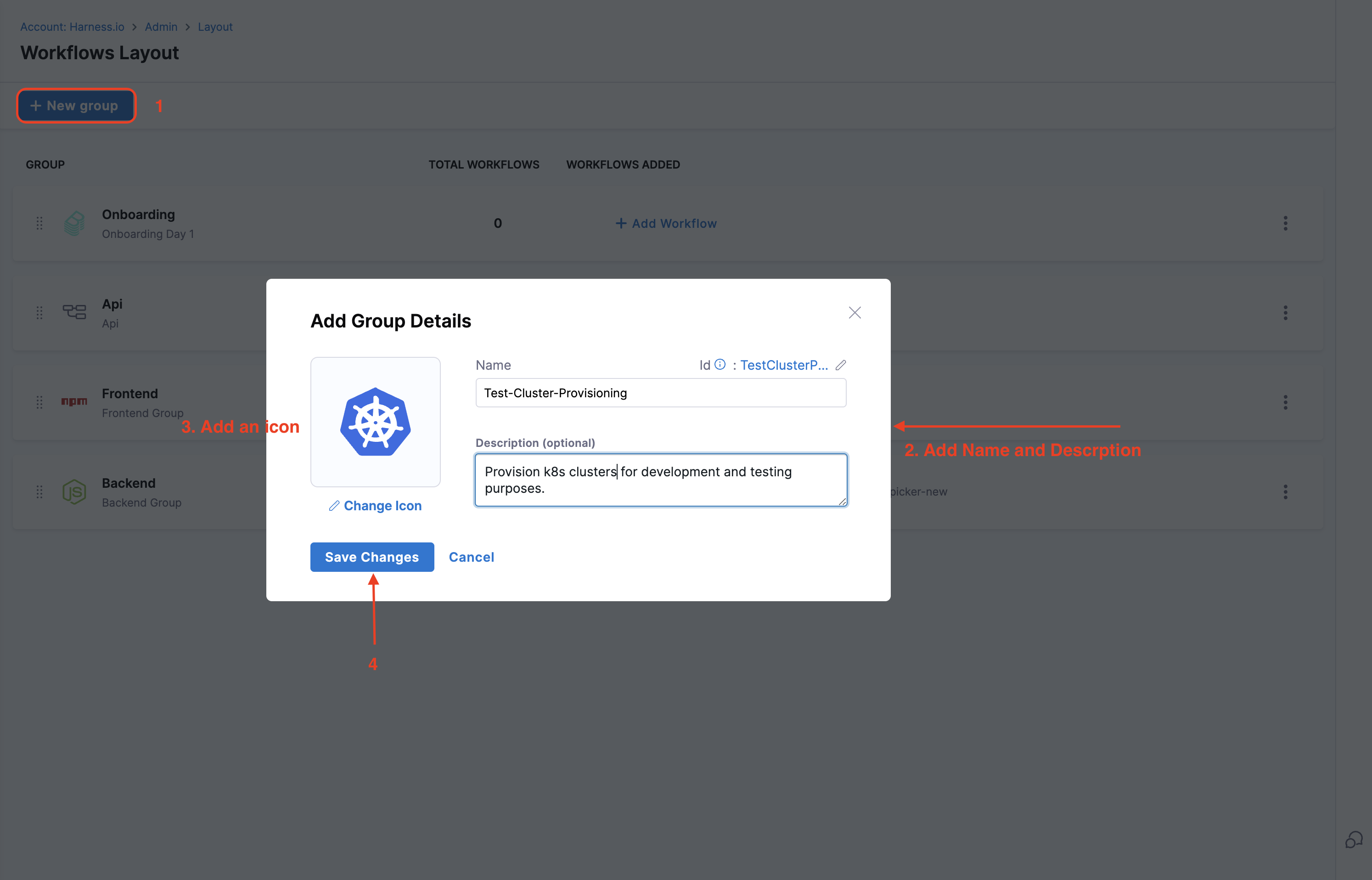 Platform Engineers (users assigned with the role of IDP Admin or having Layout edit permission) can customize the Workflows homepage under IDP Admin -> Layouts -> Workflows section by creating groups and adding Workflows to each group. These groups can be further customized using a name, icon, and description and they can be arranged in a specific order to determine how they appear on the Workflows homepage.
