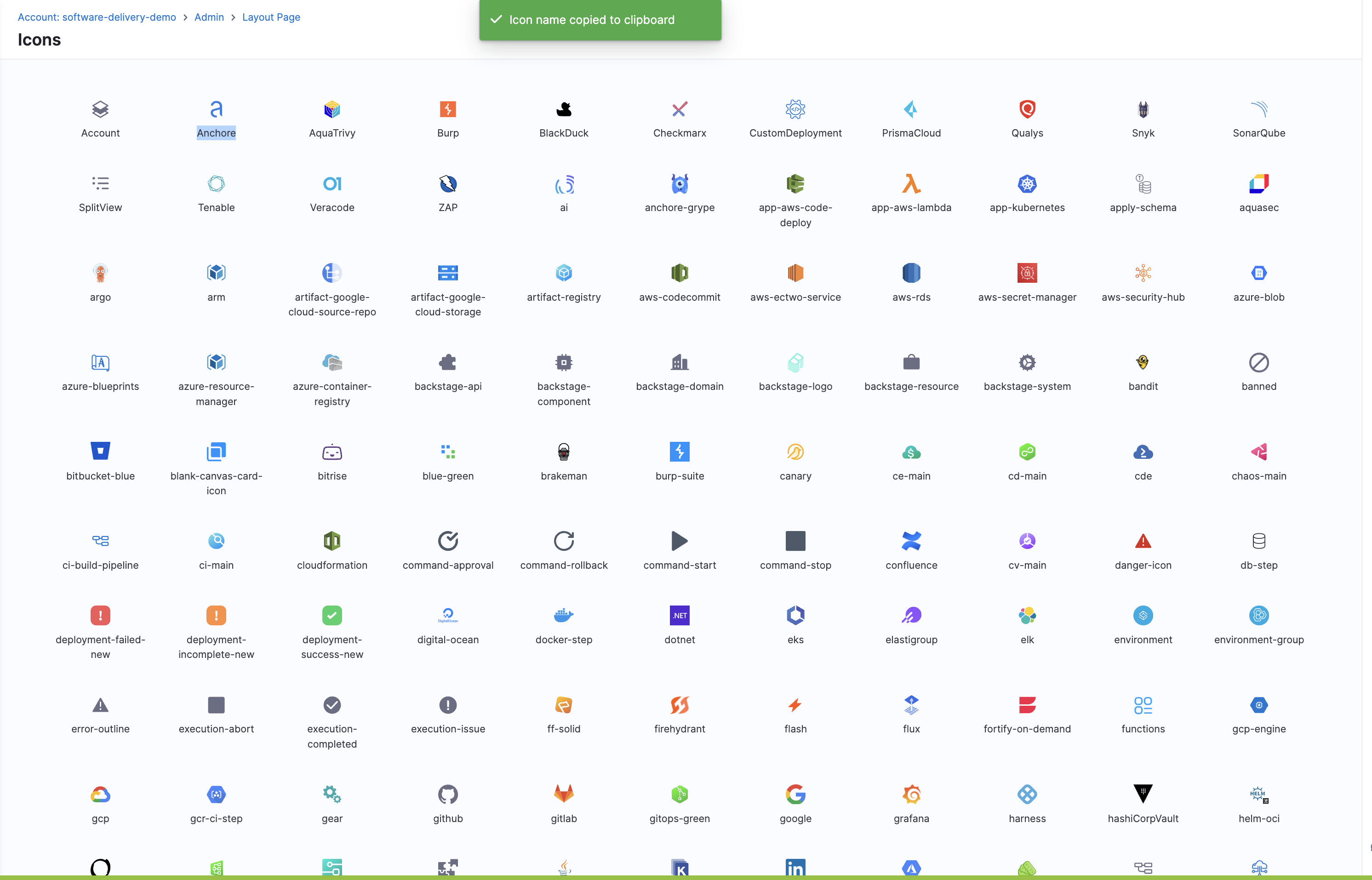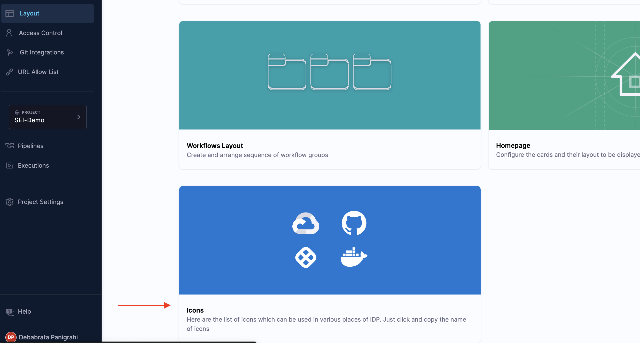 • Go to Icons under IDP-Admin -> Layout, and highlight the icon name you want to add, it will be copied, and now you can add it under the metadata.icon in the Workflow definition YAML.