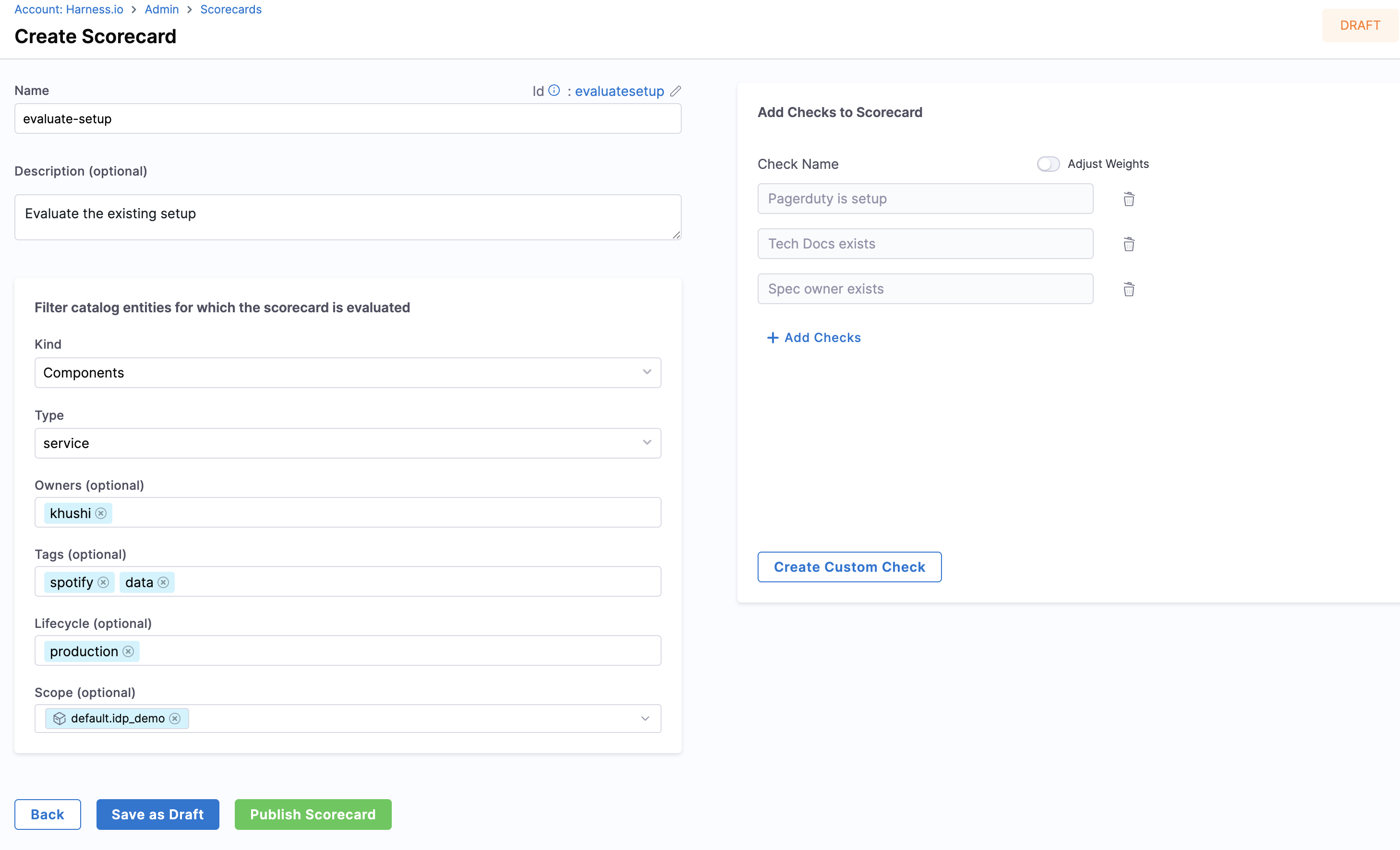 - Scope (optional): Choose where to run the evaluation- project, org, or account. The scorecard evaluates all entities within the selected scope. If no scope is selected, it evaluates entities across all scopes (account, org, and project).