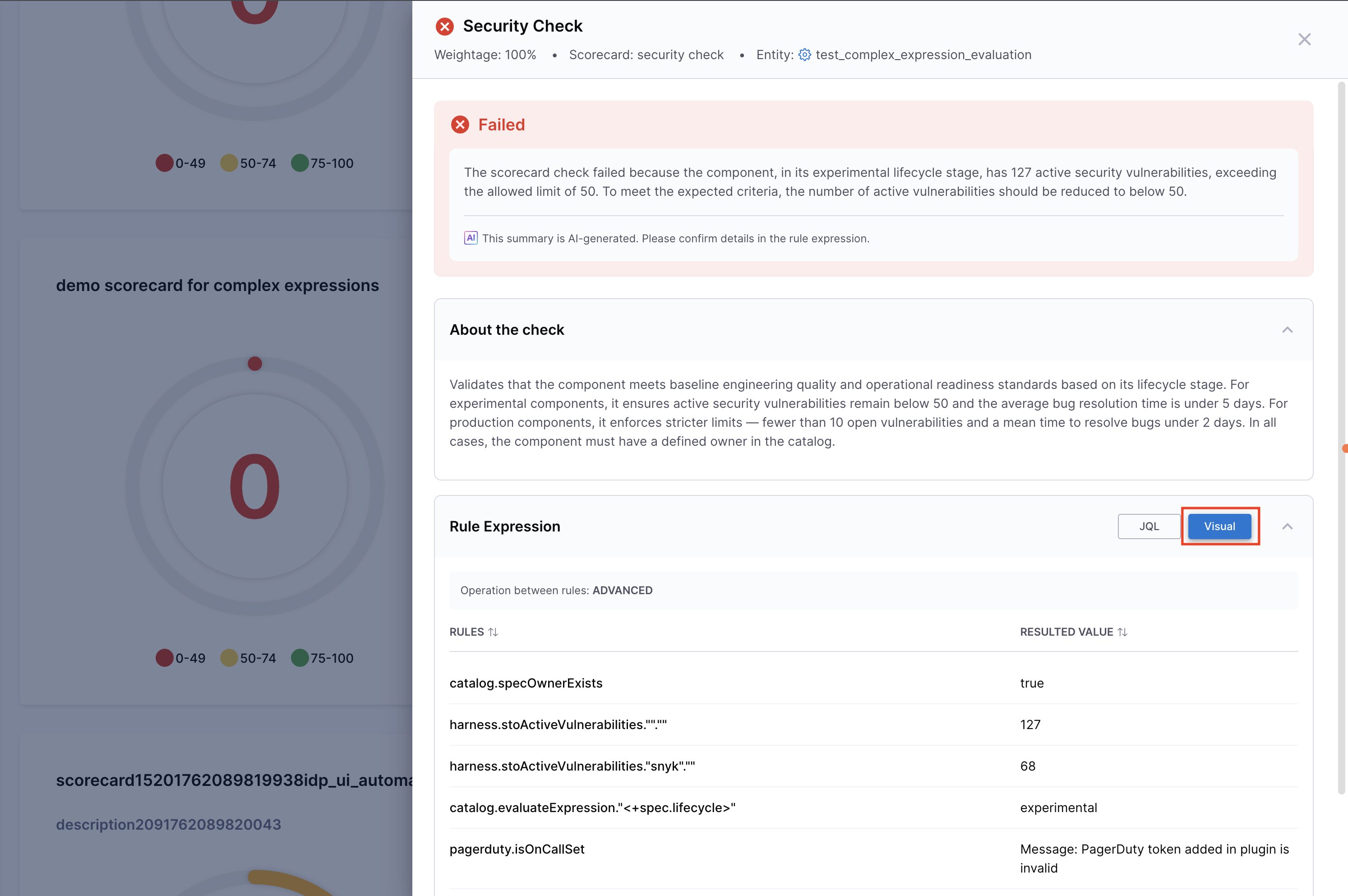 Visual View: Displays a table with all rules, their conditions, and the actual resulted values that caused the failure.