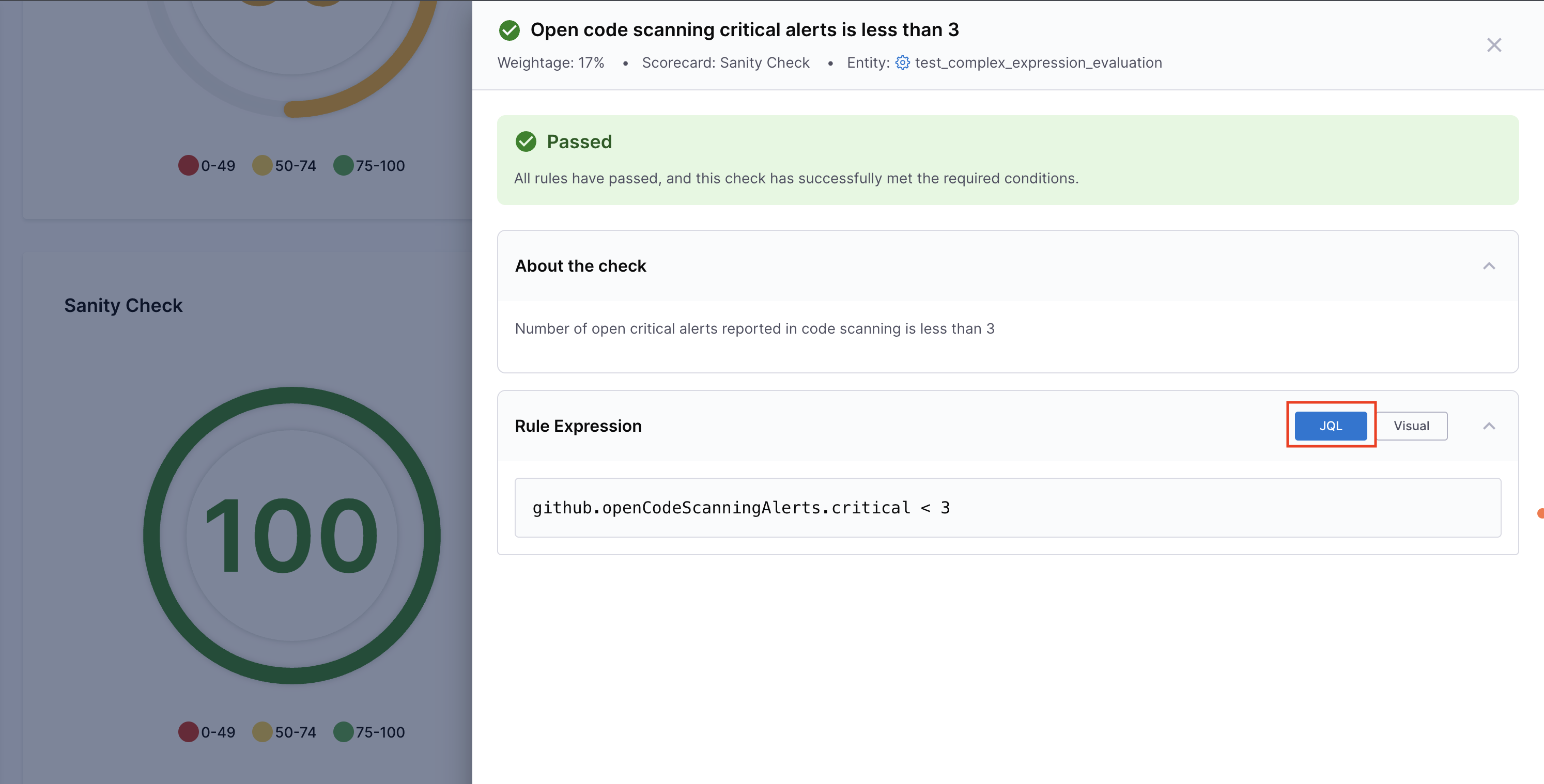 You can view detailed information about each check's execution status directly from the entity's Scorecard view. This helps you understand why a check passed or failed and take appropriate action.
