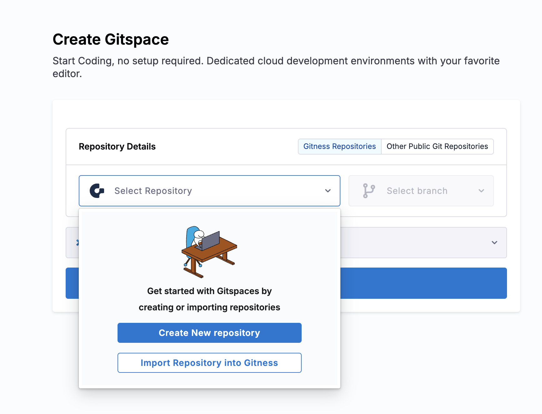 1. Once the repository is available, you can select the branch and the IDE type (VSCode Browser and Desktop are supported)