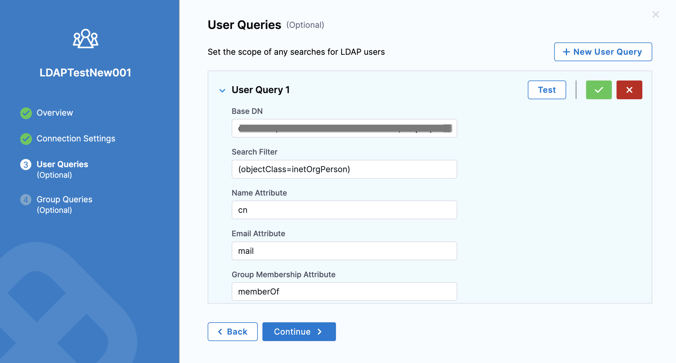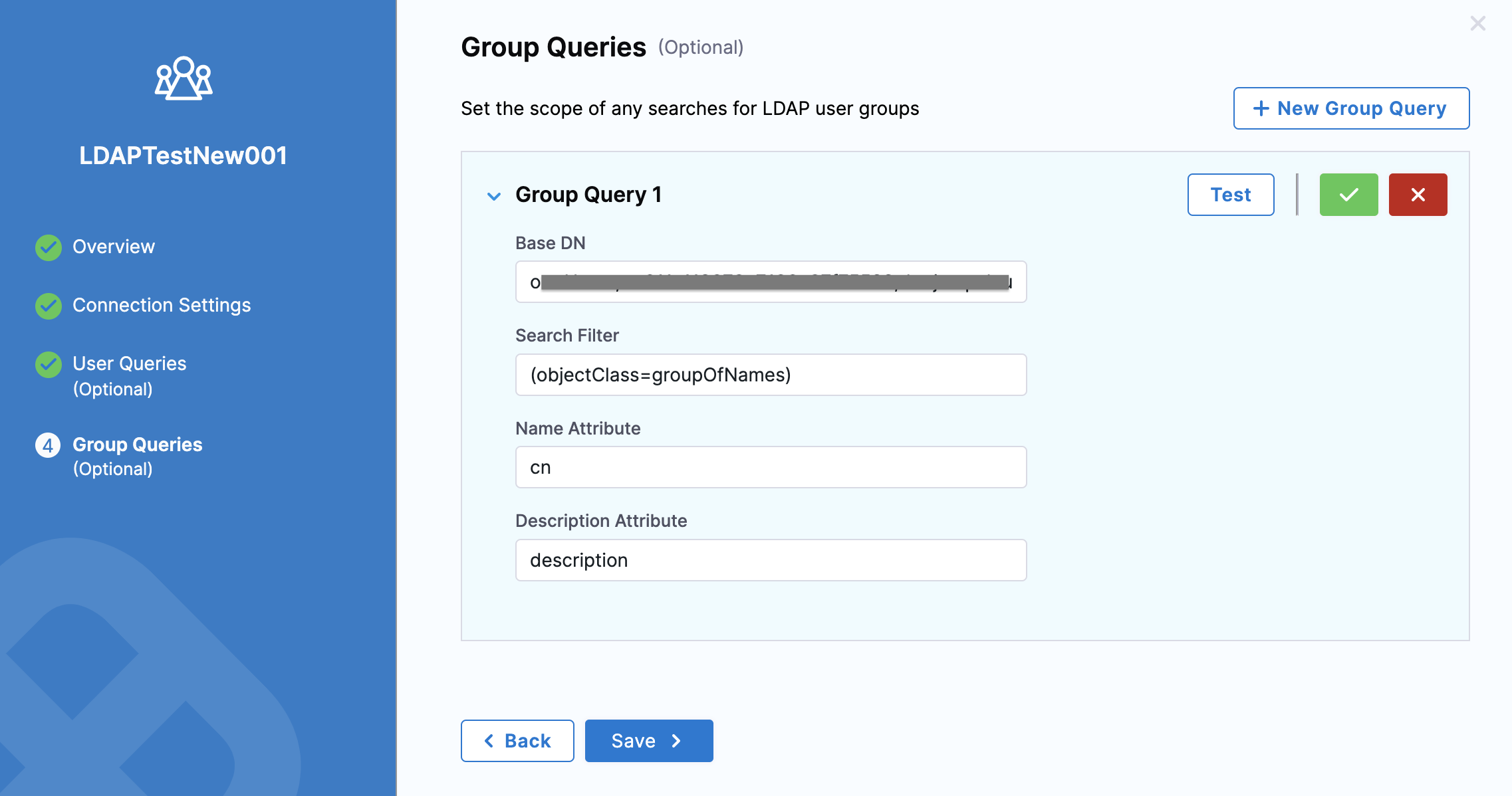 1. In Base DN, enter the distinguished name of the LDAP group you want to add. This should be the LDAP group containing the users you searched for in User Queries. To see a list of all the groups in your LDAP directory, use this dsquery command: