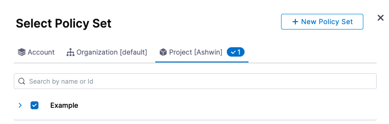 A Policy Set at the account level can be used in any Policy Step in the Orgs and Projects in the account. A Policy Set at the Project level can only be used in steps in that Project alone.