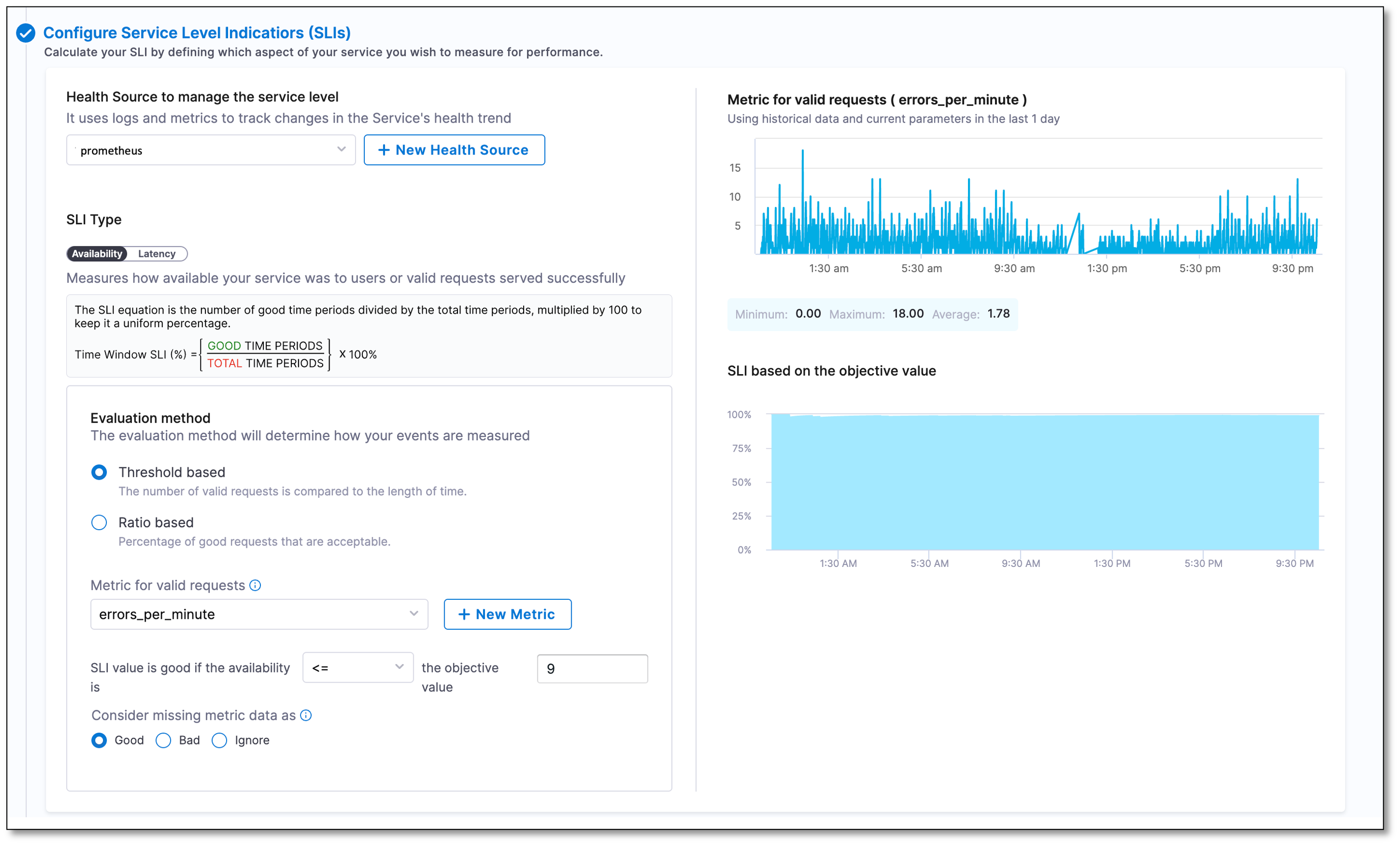 In this section, you add a health source to manage service level, select an SLI type, and configure the evaluation method.
