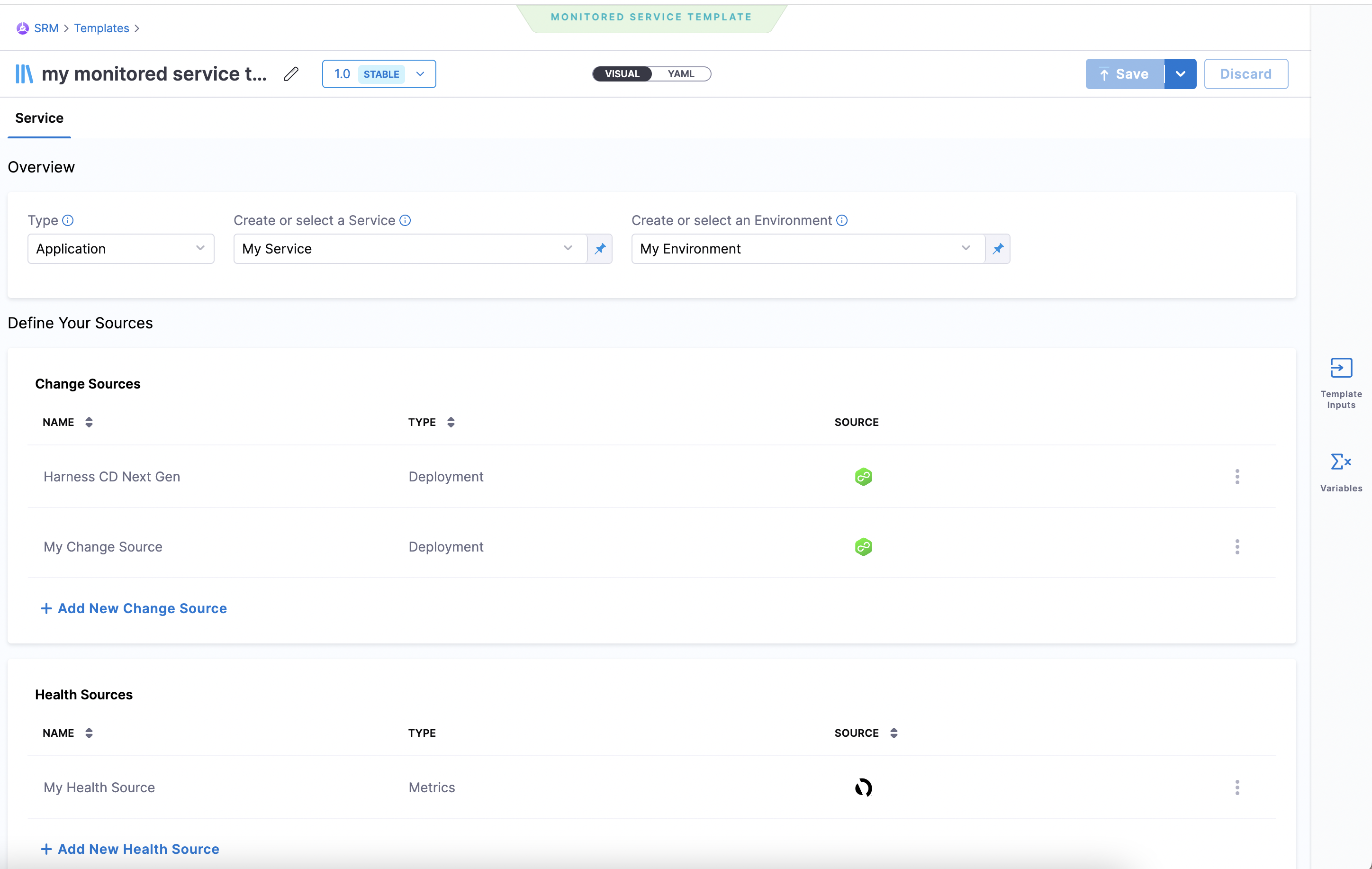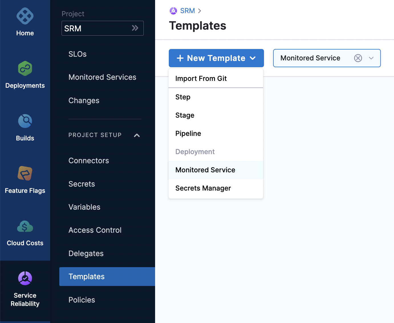 1. In Harness, click Site Reliability > Project Setup > Templates.The Template page appears. Click + New Template, and then select Monitored Service.